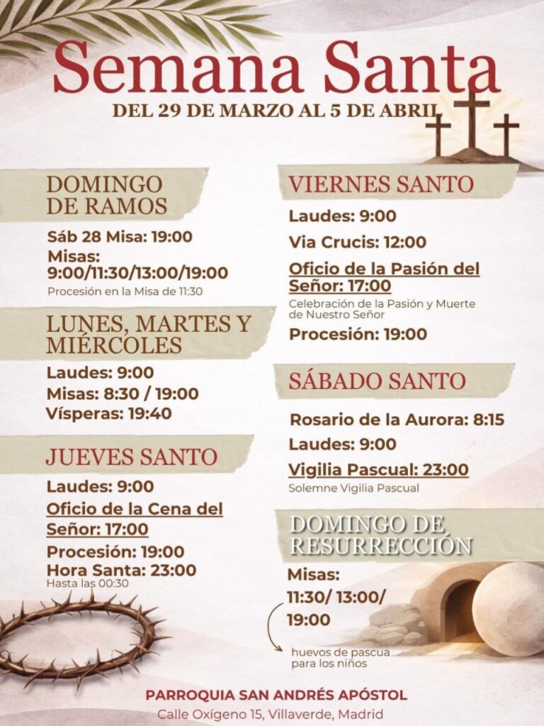 - ESCUELA DE VERANOHola a todos! Este verano ofrecemos desde la Parroquia San Andrés, a niños/as nacidos entre 2013-2018, una ESCUELA DE VERANO con diferentes actividades como ir a la piscina, excursiones, juegos, talleres… 🌊☀🥽 Fechas: 23 de junio al 4 de julio (De lunes a viernes)Horario: 9:30 a 17:30Precio: 75€ (las dos semanas) 40€ (solo una) *En … Seguir leyendo ESCUELA DE VERANO